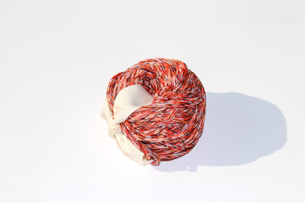 It's a yarn that looks like braided hair. White, brown, red, and orange are woven together. It's a little thick to use as a warp when weaving, but you can use it depending on your work.