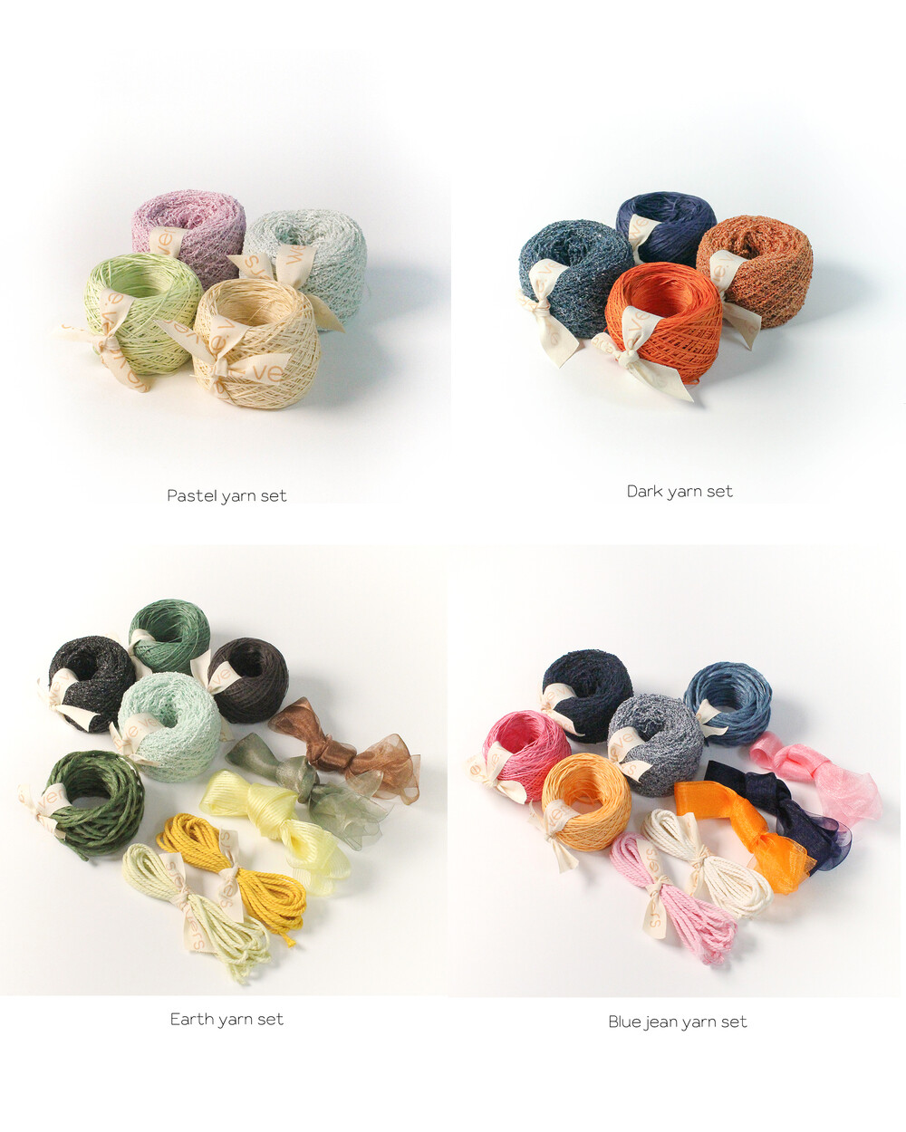 구성: cotton 2 x25g, silk+nylon 2x25g, jute 25g, ribbon 3 (each colour 4y), thick cotton 2 (each colour 4m)
