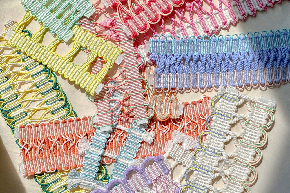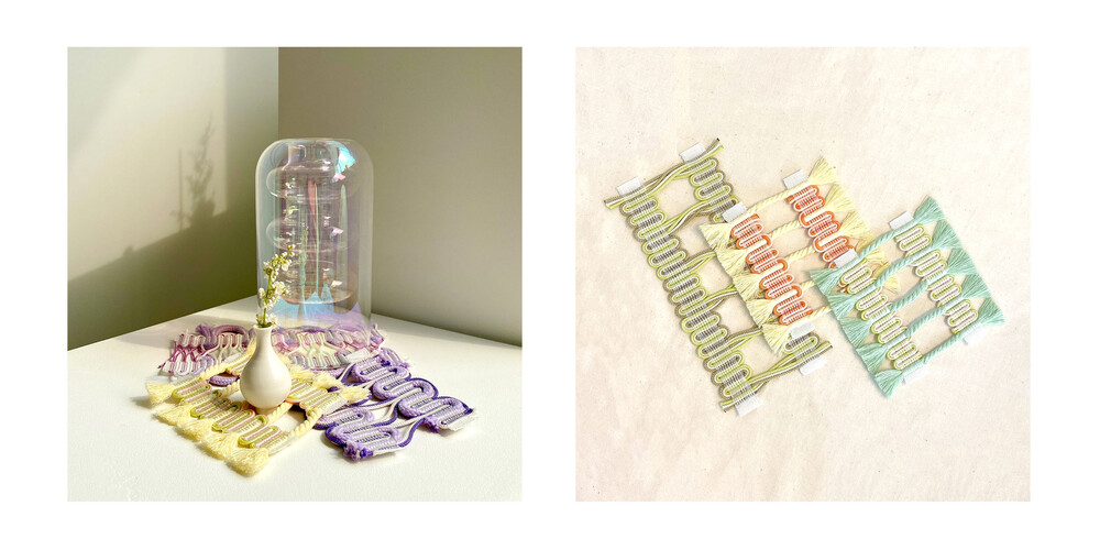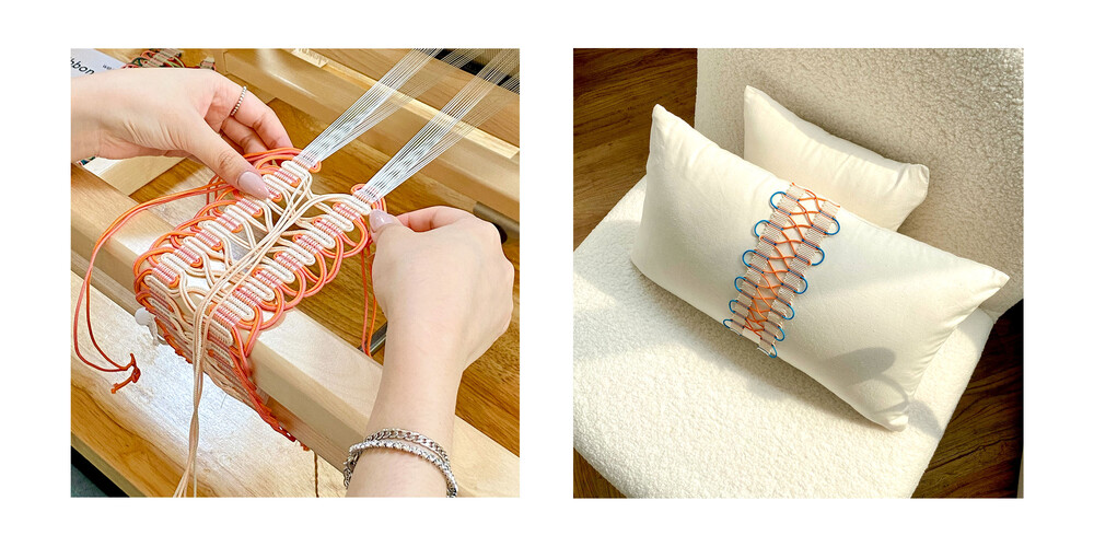 생소한 형태의 "weaving인데 어떤 기법을 활용하였나요?"라는 질문을 많이 해주셨어요. 가끔은 니트 또는 마크라메로 생각해 주시는 분들이 계시지만, loom(직조기)에서 작업하는 weaving입니다. 유럽과 미주권 텍스타일 작가분들이 작업 활동에 많이 활용하시는 weaving skills 중 하나로,수개월간 수백 개의 샘플링을 통해 we.vers만의 Ribbon Workshop이 탄생되었습니다.